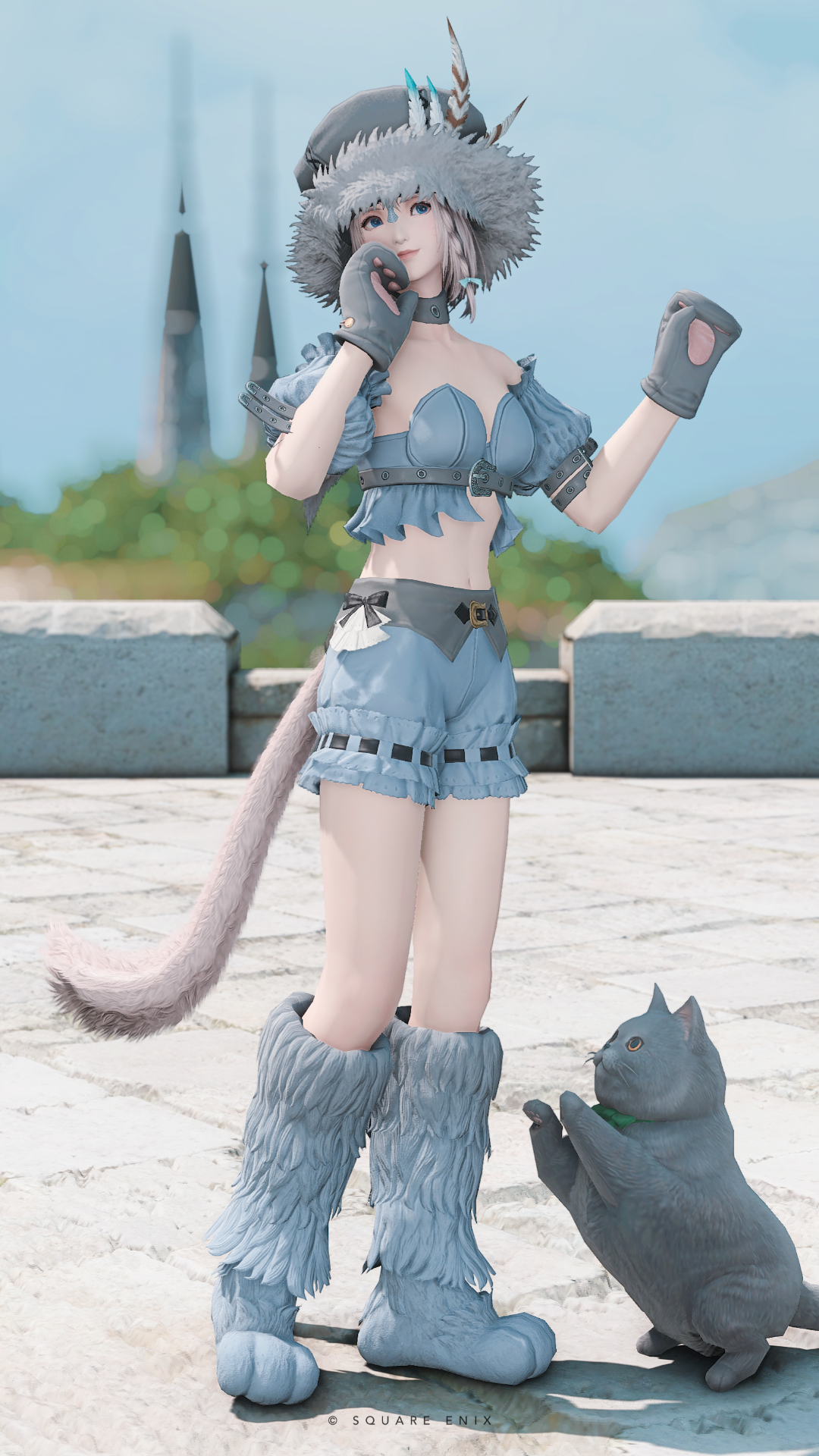 もふもふ猫ちゃんイメージのミラプリです𓏲𓎨ྀི グレー×水色でブリティッシュショートヘアっぽく𓈒𓏸 脚装備の横についてるリボンとレースがかわいい〜🩵🩶