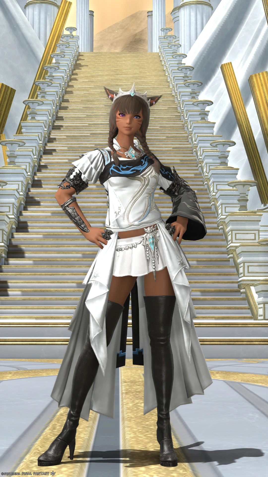 テアゴニアー・ヒーラーを基調にした白ベースで、賢者らしい知性と神聖さを表現。 黒をアクセントに加えることで、引き締まった印象とクールさを両立させました。 軽やかなシルエットの中に、強さと品のある雰囲気を意識しています。
