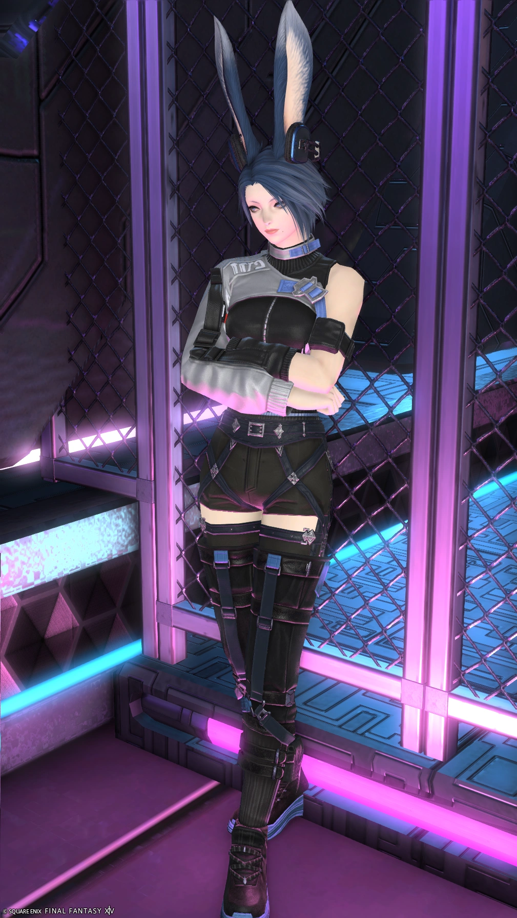 路地裏で暇を持て余しているお姉さん。ヴィエラのヘッドホンの位置良いですよね。