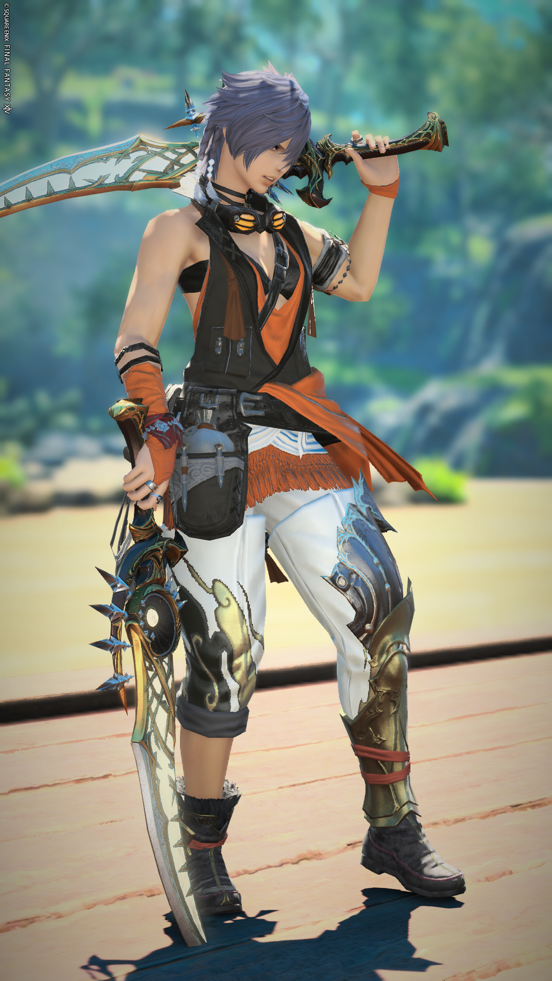 モンクさんのAF足! かっこいいデザインなので、それを活かしてみたい!と思って作ったミラプリです。 足に素肌の部分があるのでバランスを考えて、上着は袖がないのもを。 メインカラーのオレンジがしっかり目立つように配色してみました。