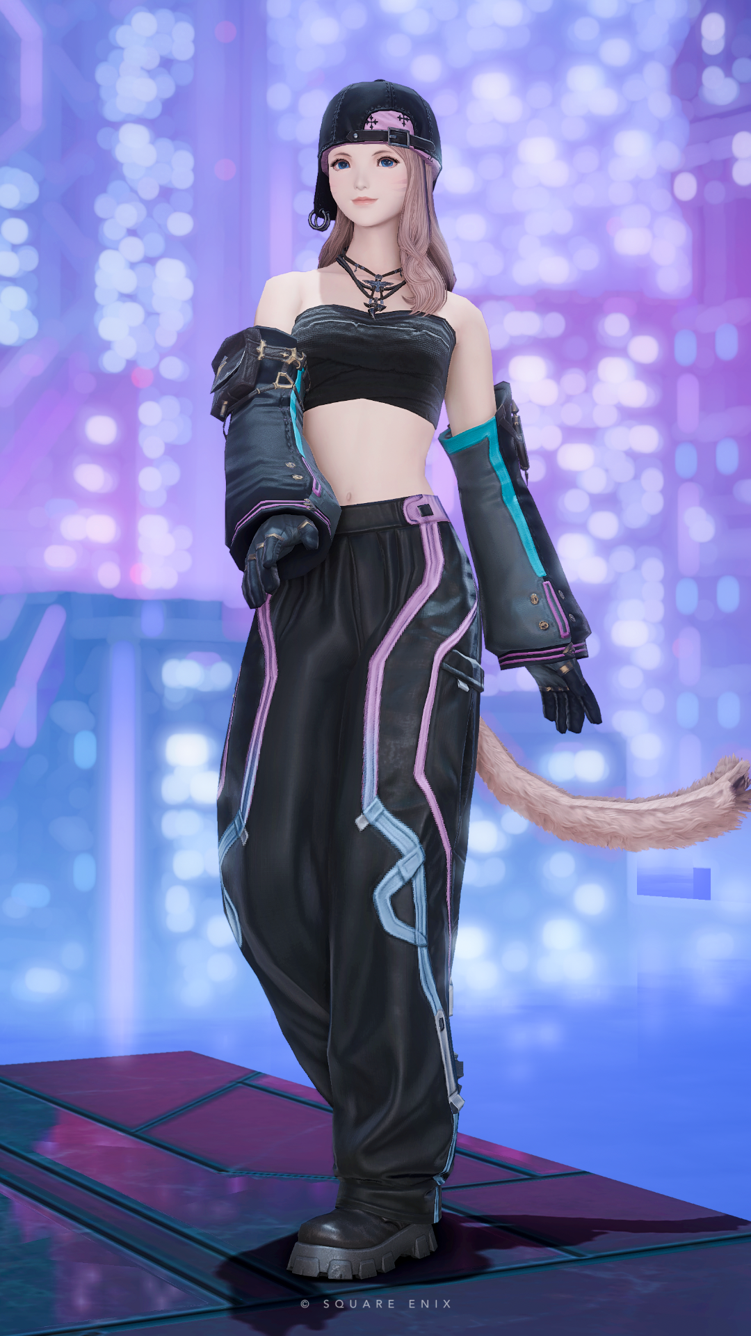 フレが作ってくれたネオンストリートカーゴパンツのグラデーションがかわいくて🩵 同じように縦にデザインのあるサイガキャス腕を合わせました!