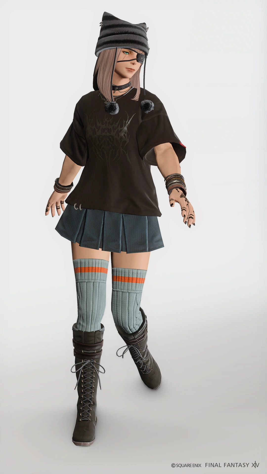 普段あまり着ないタイプをめざしたらヘビメタに目覚めた反抗期のティーンエイジャーみたいになった スカラーキュロットは結局染色してないのでREでなくてもいけます 帽子やニーハイに視線を向けたいのでシャツのプリントは染色で潰してます 武器はなんでもいいですが召喚PWが炎エフェクト+竜モチーフでなんかヘビメタぽくてよかったです 正直ハイランダーよりミコッテアウラあたりの細身で小柄な種族に似合うとは思います あとスカートが本当にギリギリの丈なのでスカートの中が見えるコンテンツや足を大きく開いて乗るマウントは要注意です